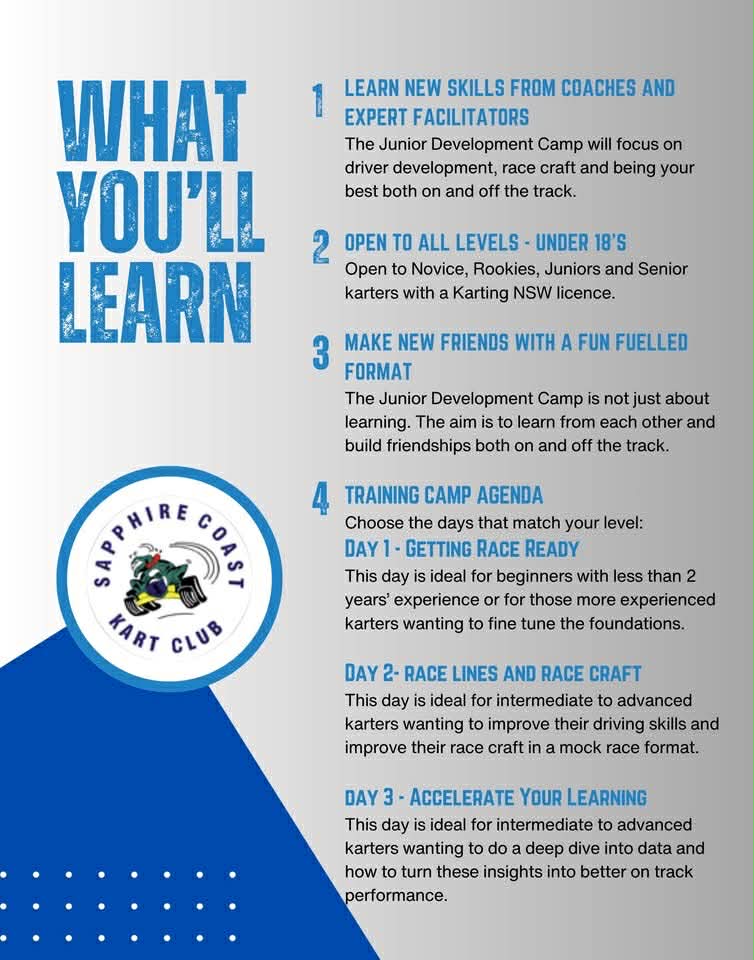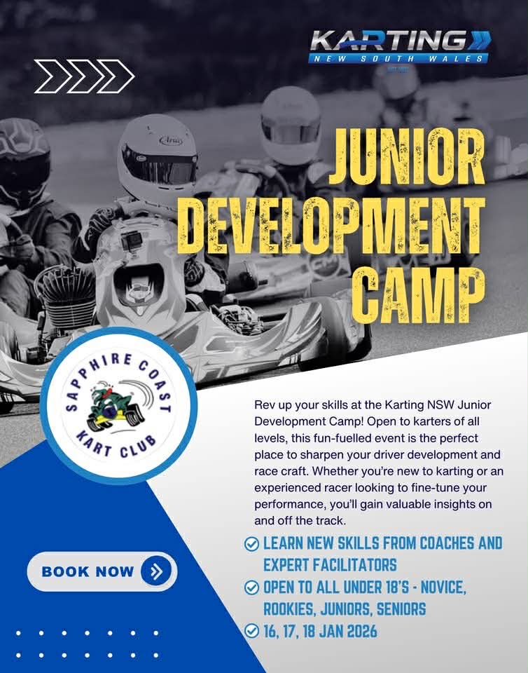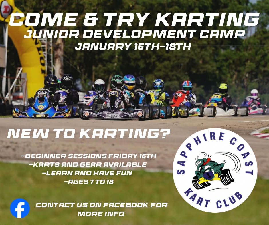 Looking for something new for your kids these school holidays? Sapphire Coast Kart Club is hosting a Junior Development Camp (Under 18s) 16-18 January 2026. Friday the 16th is dedicated to beginners and kids new to the sport.